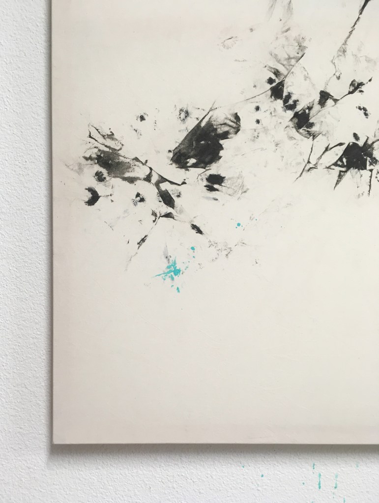 Todo se puede reducir a una mancha, entrecierra los ojos. Huellas del futuro son planos urbanísticos de trazados de ciudades aún inexistentes, pisadas de animales extraños, de inteligencias artificiales. Son paisajes en los que, lo orgánico, ha ganado a lo geométrico y controlado por el hombre, representaciones de ciudades abandonadas en las que la vegetación ahora es protagonista.